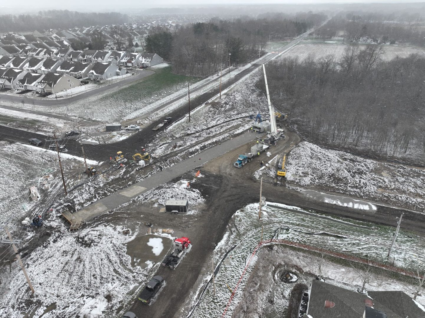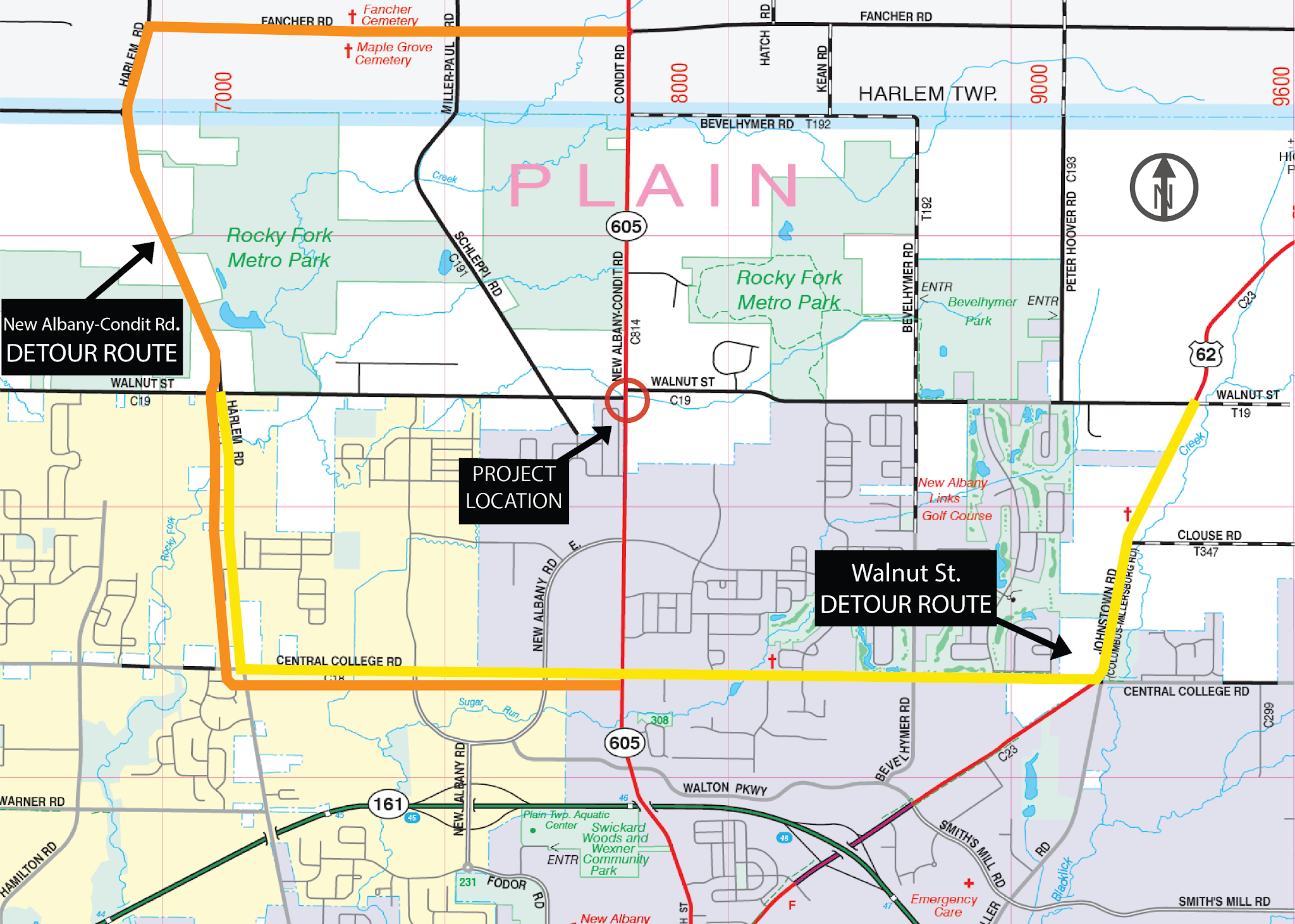 Improving the existing and deficient offset intersection geometry by upgrading 0.26 miles of New Albany-Condit Road (SR-605) and 0.19 miles of Walnut Street by constructing a modern 2x1 multilane roundabout. The project also includes the installation of a culvert replacement, closed storm sewer system, street lighting, and various other improvements.